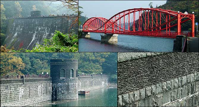 | 河内貯水池は、昭和2年に八幡製鉄所に水を供給するために造られた工業用貯水池です。堰堤だけでなく関連施設や橋なども八幡製鉄所によって造られています。頂上高189mもある堰堤はコンクリート本体の前面背面を石積みで覆うという凝ったものなのですが、その凝り方が普通ではありません。近くに寄ってみると、堰堤の規模に全く見合わない非常に小さな細工が随所に施され驚かされます。通路や堰堤にある取水塔などには、石を小さく砕いたものや天然の形状の小石をビッシリと並べて貼り付けてあり、非常に凝った装飾になっています。当時の八幡製鉄所のセンスというか、効率・機能重視の現在では絶対考えられない造りは、一見の価値有りです。是非実物を見て驚いてください。地元に住む友人に聞いたのですが、この河内貯水池には、建設当時に資材運搬に使っていた蒸気機関車がそのまま湖底に沈んでいるという噂があるそうです。なんだか面白そうですね。