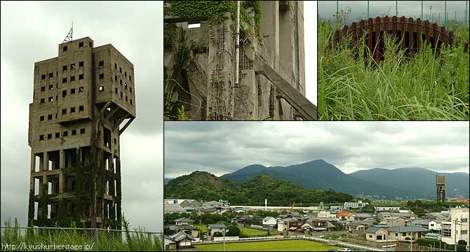 | 遠くからでもよく見える、福岡県志免町のランドマーク的存在の遺構です。高さ53mにもなるこの縦坑櫓は鉄筋コンクリート構造のワインディング・タワー型と呼ばれるもので、国内でこのタイプの縦坑櫓が現存するのは唯一ここだけです。この櫓の下には地下430mの縦坑があり、櫓上部に直接据え置かれた1000馬力の巻き上げ機で昇降を行っていました。