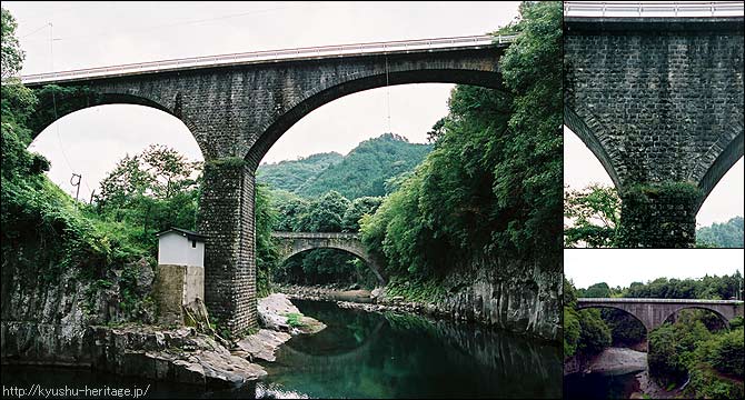 橋上の汽車からおおよそのスケール感は得られると思いますが、アーチのスパンが長い上、極端に幅が狭く、さらにアーチ最上部の橋の厚みが薄いところなど“これでいいのか?”という感じがします。正直言って「よく崩れないな」と。気になったものの橋の名前や場所なども分からなし「もう残ってないだろ」と思っていました。ところが2005年6月に出版された「九州遺産」に、この森林鉄道の石橋が“轟橋”として紹介されていてビックリ。興奮気味で現地へ行ってきた次第です。