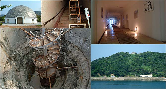 現在は“ミュージアムパーク・丹賀”の一部として一般に公開されています。上写真の右手が砲台入口、左手奥が弾薬庫の入口。砲台入口からは急角度の斜坑になっており、階段と併設されたケーブルカーに乗って砲台直下まで昇って行くことができます。入場料:大人200円・小人100円、年中無休。