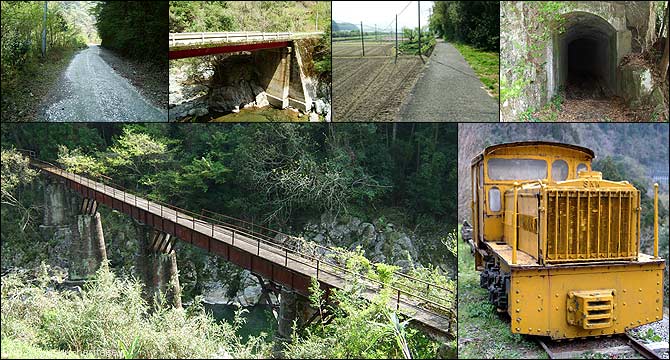 内大臣森林鉄道は九州山地の深部である山都町内大臣から切り出した木材を運ぶ為に、大正4年に造られ昭和37年(一部昭和42年)まで使われた専用鉄道です。当初貯木場があった砥用町を起点に緑川に沿って山都町内大臣の奥地へ延びていた軌道敷ですが、のちに南熊本駅(現JR豊肥本線)から私鉄の熊延鉄道(昭和39年廃線)が開通したために、甲佐駅の隣へ貯木場を移し軌道も延長されました。最盛期には本線・支線の総延長は約53kmにもなり、廃線から30数年たった現在でも多くの遺構を見ることができます。詳細は以下の報告書をご覧ください。