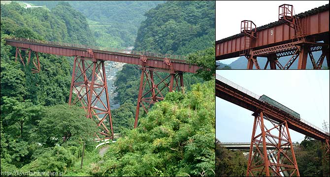 橋の下を道路が通っているので、色々な角度から橋を見ることができます。近付くこともでき、小さな部材をリベットでつなぎ合わせている様子もよくわかります。橋の下を通る太いパイプは九州電力黒川第一発電所の導水管。この発電所は大正3年竣工ですので、立野橋梁より随分昔からあることになりますね。4月〜10月は南阿蘇鉄道の名物トロッコ列車も通ります。トロッコに乗って立野橋梁と白川第一橋梁をセットで楽しむのもオススメですよ。 |