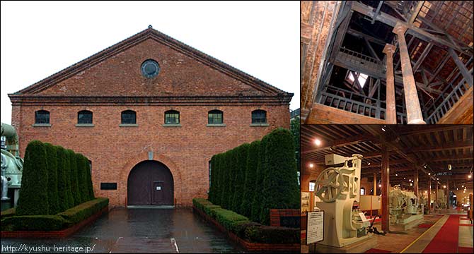 三菱重工業株式会社長崎造船所の敷地内に、安政4年(1857年)の長崎溶鉄所創業開始時からの資料を展示している史料館があります。この鮮やかな赤煉瓦造の建物は、鋳物の型に使用する木型を作る工場として明治31年に竣工。昭和60年に史料館として改装されました。館内は時代やテーマごとにエリアが分けられ、国指定重要文化財に指定されている日本最古の動力工作機械や巨大なエンジンやタービンの実物、写真パネルなど約900点の展示物があります。ひとつひとつの展示物をじっくりと見ていくのは結構な時間が必要。かなり見ごたえのある量です。展示は建物の1階部分のみですが、一部吹き抜けがあり二階部分と屋根を支える木製トラスの様子を見ることができます。写真中央の2本の柱は別棟の工場で使われていた鋳鉄製の柱で、明治初期のものと推定。
