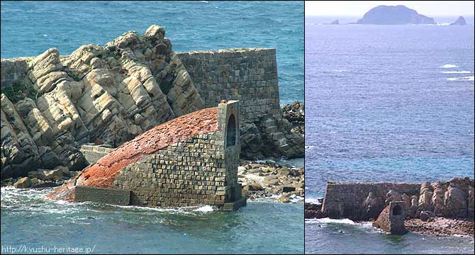 熊本県天草市牛深町の烏帽子瀬という小さな岩礁に、明治期のわずかな間だけ操業した炭鉱「烏帽子坑」があります。陸地からおよそ200mもの沖合いの岩礁に、海面から立ち上がりぽっかりと口を開けている坑口はかなり異様で他に類を見ません。背後には天然の岩礁を取り込んだ石垣で防波堤がつくられており、このような特異な場所に設けられた坑口を荒波から守っています。海面から立ち上がっている坑口は、下部が石組みで上部が煉瓦巻。周辺の岩礁や海面下には四角に切り出された石が並べられているのも見えます。おそらく坑口を囲むように桟橋か埋立地のようなものが作られていたと考えられますが、今となってはどのようになったいたかは不明です。どうせ海底の地下を掘り進むのであれば、海岸から掘削をすればよかったのでは?と、思ってしまうのは私だけ?