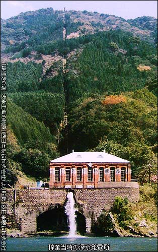 この深水発電所が製紙工場に電力供給をはじめたのは大正10年のことである。最大出力は880kwになっているが、年間平均出力は560kwと非常に小さなものだ。心臓部の水車と発電機は、運転開始の大正10年から更新されることなく昭和63年まで使用された。これら発電所内部の機器設備は、現在も煉瓦造りの建物の中で静かに眠り続けている。