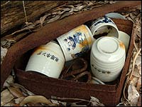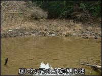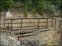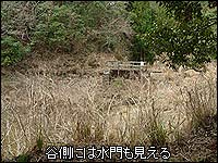 地上にハッキリと姿を現したコンクリートの水管の脇に沿って歩き進めると、藪の間から窪地が見えてきた。池だ。思ったとおりに何らかの構造物もある。調整池は底に浅く水が残る程度で、ほぼ枯れている状態だ。地形を見ると、谷に堰を作って幅約20m奥行約4、50mの池を形成しているが、一見するとただの窪地の水溜りにも見える。今まで辿ってきた水管がダイレクトに池に注ぐようになっているが、小さな穴を開けてそのほとんどをコンクリートで塞がれていた。