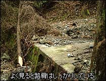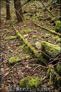 またトンネルの中にはトタンやワイヤー、鉄筋などの資材が置いてあったが森林鉄道に関係するものは見つけられなかった。トンネルを抜け数メートルも進むと一気に幅が狭くなり、同時に落ち葉の中から枕木が姿を現した。まさに森林鉄道の“跡”になってきた。うーん。いい感じだ。もう気分は完璧に「山さ行がねが」だ(笑)。この先は道路化されていない区間が合流点まで約3.5km続いているので、当時の姿をとどめた軌道跡を期待できる。しかし折角気分が乗ってきたところだが、今回はコレで退散だ。カメラの感度を上げているので分かりづらいと思うが、実は日が暮れてかなり暗くなっている。続きは次回の楽しみに取っておき、そのときは1日たっぷりと時間をとって探索しよう、そう考えながら帰路についた。