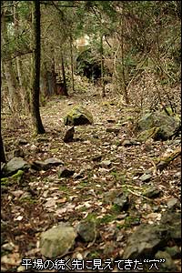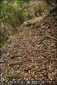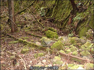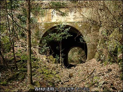 林道から森へ入って数メートルも進んでいない。内大臣森林鉄道のレールとの記念すべき初めての出会いはなんとも簡単なものだった。まったく「あら〜、こんなところにあったのね」だ。ただ2本のレールの間から生えている杉の木が、このレールが眠りについている時間を語っているように思う。のっけから大きな発見でいい気分で更に奥を目指した。平場は1.5車線ほどの幅で続いており、コンクリートと石垣でしっかりとした路肩を保っている。しかし、山側からの倒木と土砂崩れが半端でなくなかなか前進できない。山側へ崩れた土砂を登ったり、はたまた谷側へ迂回したりでどうにか前進する。と…、倒木などの障害物がなくなった先に遂に“トンネル”が見えてきた!