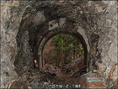 トンネルだ!坑門前に土砂が崩れているもののコンクリート製ポータルの立派なトンネルだ。扁額などはなく、全長は10〜15mと短いものだが、径は大きくトラックなどでも十分通行できるサイズはある。トンネルの発見に興奮しつつ内部へと入る。坑門の入口と出口のポータルはコンクリートだが、内部は素彫りのままの状態で岩盤がむき出しになっており、壁側には崩れた形跡も見られる。