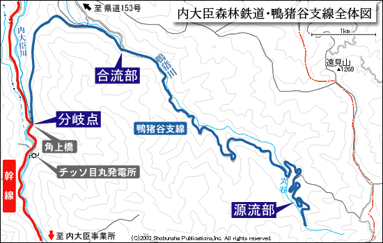 分岐点である角上橋付近からスタートする支線は、内大臣川と鴨猪川を隔てる天主山から続く尾根を大きく迂回するルートを辿る。尾根を廻ったルートは合流部で県道153号より始まる林道と合流し、内大臣川と同じ緑川の支流になる鴨猪川に沿って山を登っていく。ここからは林道化されており、しばらくは線路の痕跡は見つけにくくなる。源流部の穴谷手前付近で林道と軌道跡は分かれるらしいが、地図では林道が描かれていない。下記の地図や1/25000地形図などでは実線で描かれているのが軌道跡と思われる。終点は尾根に近い「穴谷」と呼ばれる所にあるらしいが、伐採の最前線では状況に応じて線路を敷いていたらしくはっきりとしたことは分かっていない。この鴨猪谷支線を知ることになった「鉄道廃線跡を歩く]」(JTBキャンブックス)と「全国森林鉄道」(JTBキャンブックス)でも、大まかなルートが記されている他は情報は少ない。実際に踏査も行われていないので、自分で現地調査を行うにはとても面白そうだ。また、ほぼ全線に渡って道路化された幹線に比べ、道路化されていない区間を多く持つのもこの支線の魅力といえよう。
