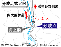 実は内大臣森林鉄道の調査にあたって一番最初に訪れたのは、この鴨猪谷支線である。「内大臣森林鉄道・幹線」の報告書でも書いたが、私にとって内大臣林道はよく知っている道だ。また、鴨猪川に沿った林道も何度か通ったことがある。そんなよく知っている場所に「鉄道」があったとは驚きだった。まず現地へ行く前に、カシミールの1/50000と1/25000の地形図上で事前調査だ。地図で見る限り、この鴨猪谷支線は角上橋を渡ってすぐの分岐点から始まるように見える。私の記憶ではそんなところに軌道の痕跡などなかったと思う。ん?よく見ると分岐点より少し進んだ場所にトンネルの記号があるぞ??(ちなみに上記地図はデジタルマップルだがトンネルの記号はある)林道からちょっと入ったところに「森林鉄道」に「廃トンネル」のセットとは、なかなかおいしい組み合わせではないか。それでは現地へ行ってみよう。現地調査は合計4回行っており、順を追って紹介していこう。なお分岐点付近についての詳細は後述する。