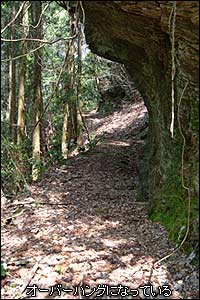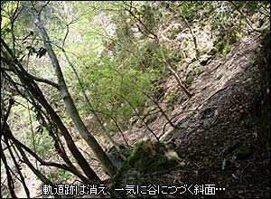 トンネルから数十メートルで路盤が崩れ、2本のレールが宙ぶらりんになっている場所に出た。足元は落ち葉や崩れた土砂などが堆積しており、たまに路肩に枕木の端が顔を出す程度だったが、実はレールがちゃんと続いているようだ。予想通りに当時のままらしく、枕木やレールは撤去されていないのだろう。軌道跡は木々が生茂る急斜面という立地のせいで日当たりが悪いのか、下草は全くと言っていいほど生えていない。代わりに落ち葉が分厚く堆積している。所々で山側から崩れてきた土砂や倒木が行く手を阻む場面もあるが、概ね歩きやすい。しかし急斜面を横切るルートゆえ、この様な半トンネル(?)の様な強引なところもある。また、山側から大きく路盤自体が谷へ崩れて喪失している所では、一歩足を掛け間違えるとそのまま谷底に滑落する危険性があり十分に注意して通行した。