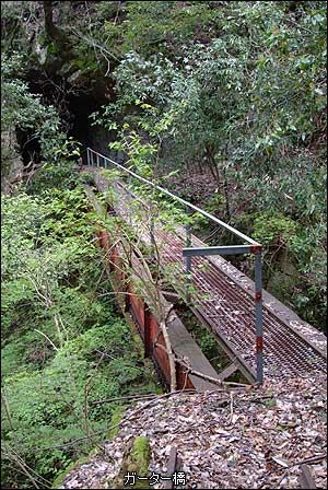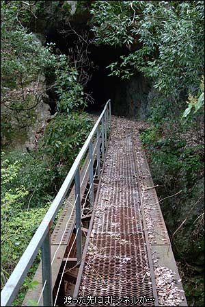 なんとトンネルが真っ黒な口をあけているではないか!再び予想外の発見に大興奮。テンションも一気に上がってきた!よし、前進だ!…しかし…渡れるのか?この橋?…ハッキリ言ってかなり怖い。長年に渡って放置されているのである。しかし、よく見てみるとレールの間には鉄製の網が架けられて、さらに片側だけだが丁寧に「手摺」のようなものも鋼材で作り付けられている。そう、人が渡れるように鉄道橋から歩道橋に明らかに改造されているのだ。恐る恐る一歩づつ橋の上を前進するが、足元も手摺も案外しっかりしたモノで安心して渡れた。橋を渡りきった先はすぐに素掘りのトンネルが口を開けている。長さは10数メートルくらいだろうか。内部は崩れた痕跡もなく安定しているようだが、反対側の出口付近に土砂と共に大木が崩れていた。国土地理院の1/25000地形図でも記載されていない橋やトンネルは現地に行かなければ、その存在すら知ることができない。現地に立った者だけが知りえることができるのだ。まさに遺構探索の醍醐味はそこにあるように思う。