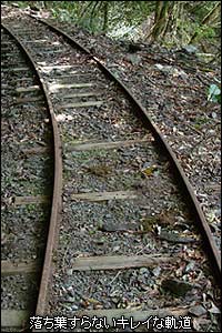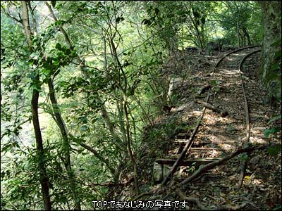 トンネルを通過した辺りから、地形が更に険しいものになってきた。右手山側はほぼ垂直で崖のようだし、左手の谷側も覗き込むのが怖いほど落ち込んでいる。しかし今までとは対照的に足元はとてもいい状態だ。枕木とレールが非常にきれいな状態で残っており、今、向こう側からトロッコが走ってきてもなんの違和感もないような風景が目の前にひろがっている。まるでタイムスリップしたかの様な光景にちょっと感動。