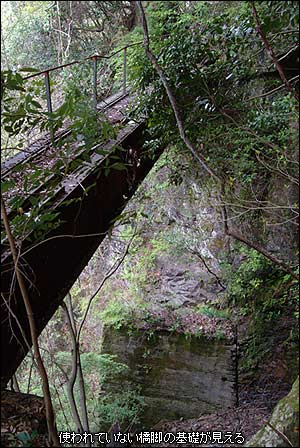 この先ずっとこのままの状態が続けば素敵だな、なんて思っていたがこの険しい地形が許すはずもなく度々路盤が谷に落ちていたり、山側から崩れていたりして難儀させられる。そのような中、2本目のガーター橋が現れた。1本目のガーダー橋と同じく20mほどの長さで、レール間の鉄網や手摺の改造も同じだ。よく見ると橋直前の路盤が崩れて喪失しているが、レールとL字の鋼材で歩道が作られている。この支線は森林鉄道廃止後もしばらく人道として林業関係者に使われていたのだろうか。更に角度を変えてこのガーダー橋の下を見てみると、コンクリート製の橋脚の基礎のようなものがある。