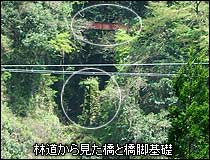 おそらくガーター橋が架けられる以前は木製の橋で、そのときに橋脚の基礎として使われていたと推測できる。このほかにもすぐ隣に石組みの橋台と思われる痕跡や、コンクリートの構造物などが複数残っており、以前は違う形態の橋が架かっていたことを裏付けている。ちなみにこの橋から内大臣林道がよく見える。ということは向こうからもよく見えるはずだ。帰りに内大臣林道側からこの橋を探してみたら簡単に見つけることができた。 |