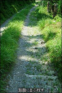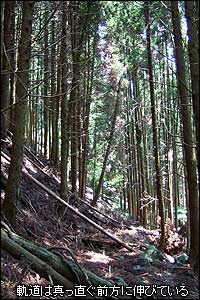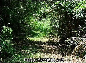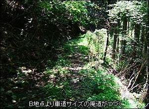 林道としては十分な道幅で、路面もしっかりしている。はたして軌道跡なのか不安になるほど快適だ。しばらく進むと右手に大きく展望が開けてくる。そのA地点で砂利の路面に枕木が現れた。やっと軌道跡である確たる証拠が出てきたホッとした。やはりこのルートで間違いはない。しかし徐々に勢いを増す路面中央の雑草が、この先「車道」としては行き止まりであることを予感させてくれる。案の定、数百メートルも進むことなく、B地点でその予感は的中する。自動車がギリギリ方向転換出来る程度の広地で一見林道は終わっているように見えるが、よく見ると藪の中に2方向に分かれている道の痕跡が確認できた。右手は北へ向かっており、このすぐ先にあった「中尾」という集落跡へ伸びている。中尾も角上と同じく昭和30年代までは地図上に地名の表記がある。しかし、無人となった現在は記載されていない。さて、左手のもう一方は西に延びており、こちらのルートが角上へと続く軌道跡と思われる。バイクはここに停めて、歩きに切替だ。