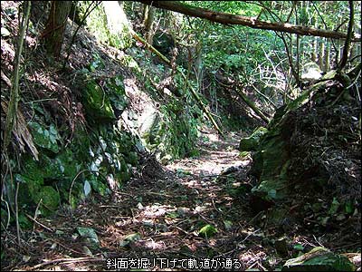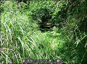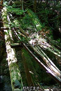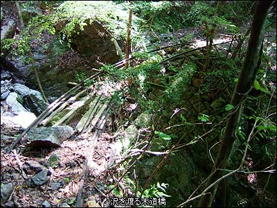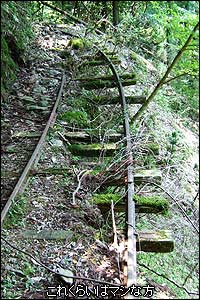 一見、路盤だけが流されて、レールが宙ぶらりんの状態なのかとも思った。しかし近づいてみると…。長さ5mほどの木造橋だ。しっかりとした石組みの橋台に直径30〜40cmくらいの丸太を3本かけ、その上に枕木とレールを敷いていたようだ。現状は中央の丸太1本が落下しており、枕木も殆どが朽ち落ちている。廃線後にだろう、人が歩けるようレールの間に木を並べて針金で括ってあるが、今やそれまでも朽ちている。一瞬、二本のレールにそれぞれ足を掛けて渡って行けないかな?なんて考えもしたが、落ちたらシャレにもならないので、一旦沢に降りて迂回した。 |