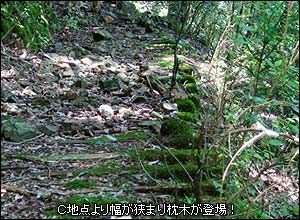 いつものごとく靴紐を締めなおしB地点から歩き出した。夏草の激しい藪はすぐに薄まり、車道サイズの道がしばらく続いた。足元はしっかりしていて歩きやすいが、真夏という季節柄か蜘蛛の巣が非常に多く、小枝を振り回しながらの前進となる。10分ほど進むも森林鉄道の痕跡は現れず、雰囲気的にはただの(車道の)廃道という感じで不安になってきた。しかし、他に間違えるようなところもなかったので前進を続けると…。ついにC地点で枕木発見!さらに道幅が今までより狭まり森林鉄道サイズになっている。と、いうことは合流部からこのC地点までは軌道跡を林道(車道)転用されていた訳だ。何故こんな中途半端なところまで林道(車道)転用を行ったのだろうかと疑問が生まれた。この件についての考えは後述する。