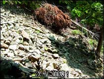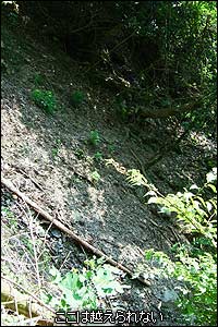 慎重に一歩一歩進んでいくも、E地点で遂にこれ以上の前進を断念せざるを得ない状況になった。幅は10mも無いが、山側から大きく路盤が谷底に持っていかれてしまっている。斜面の角度は垂直に感じるほど急なもので、横切ることは出来なかった。GPSで見ると前回の到達点まであと100〜200mといったところだ。残念だがここで引き返す。