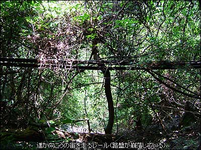 手元のGPSでは前回調査の到達地点が、随分近くであることを示している。が、片方が絶壁で空が見えないこのような谷では、衛星の捕捉が難しくイマイチ精度が安定しない。しかし、とりあえず“近く”ということは分かるので気持ちも高ぶる。ところがその気持ちを打ちのめすかのごとく軌道跡は最悪最強の状態になってきた。とにかく路盤が谷底に落ちているのである。谷底は見えないからどのくらい深いか分からないが、見えている範囲でも何十メートルもある。落ちたら間違いなく死ねる上に、発見もしてもらえそうに無い。山側の崖に僅かに残っている路盤を慎重に進む。しかしレールはなんとも頑丈なものだ。下の写真は路盤崩落した箇所を山側にへばり付いて撮影したものだ。こんな調子でレールが宙を走っている様は、写真で見ると笑ってしまう。もちろん現地では笑える状況ではないが。