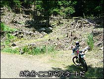 前回の調査で見つけた、林道脇の伐採現場に露出しているA地点に到着したのは、正午を過ぎた12時40分。バイクを林道の脇に停めて靴紐を締めなおし、終点目指して、さあスタートだ。