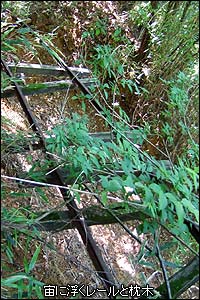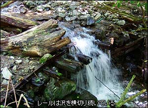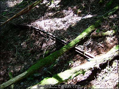 バイクを停めて、歩き始めて約1時間半。遠く谷底にあった沢も、いまは2mほど下を流れている。軌道跡のレールは、山側から路盤ごと土砂に押されたのか写真のように(45度ほど)斜めに傾き、浮いた状態になっている。とても軌道跡を歩ける状態でないので、一旦沢に降りて、軌道跡を追いながら沢を上る。20〜30mほど沢を上っただろうか、地形は緩やかでU字状の断面になっていて、沢の流れもほとんど無くなっていた。レールは斜めになりながらも沢に沿って延びていたが、倒木や土砂が押し曲げた箇所でその姿が途切れていた。
