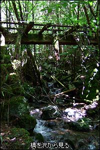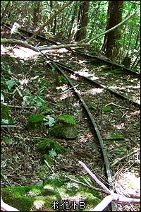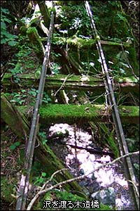 歩き始めて20分が経過した。緩やかな地形になり崩落もなく、楽に軌道の上を歩けるようになったときだった。B地点付近で、行く手にかなり半径が小さいカーブが見えてきた。このカーブを横転転覆しなように通過するには何キロが制限なんだろう。木材を山積みのトロッコなら人が歩く速度ぐらいでないと危険なのではないだろうか。そんなことを考えていると、そのコーナーのすぐ先に橋を見つけた。小さな沢を跨ぐ橋は長さ4mほどだろうか。石組みの橋台に、30cm角くらいのかなり太い角材2本を渡しただけの単純な構造だ。角材の1本は腐って真っ二つに折れて沢に落ちていた。残りの1本の上を渡る勇気はないので、一旦沢に下って迂回することにする。