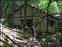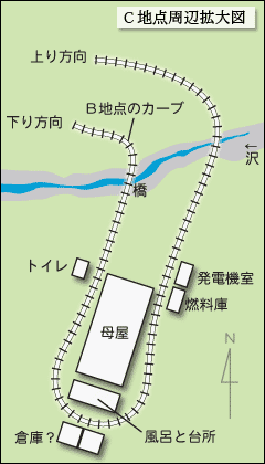 沢から軌道へ這い上がりC地点へさしかかると、木々の合間から建物が姿を現した。こんなところに平屋の廃墟があることに驚きつつ周辺を調べる。プレハブ造りのせいか、そんなに古くも感じないが、この支線が使われていたのは昭和42年までなので、少なくとも38年以上前の建物になる。建物は大小あわせて6つほどあり、軌道はその合間を縫って大きく折り返している。建物周辺の位置関係はおおよそイラストのようになる。