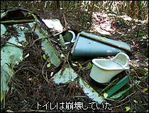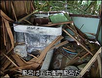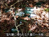 この廃墟は飯場だったらしく、トイレ、風呂、食堂などが揃っており、他に事務所(倉庫?)のような建物もある。一番大きな母屋には広間が幾つかあり、ここで寝泊りや休憩をしたのだろう。驚いたことにテレビを見つけた。とても電気が来ているとは考えられないが、少し離れた別の建物の中にエンジン式の発電機があり、自家発電していたようだ。建物の周りには色々なものが散らばっていたが、落ち葉に埋もれている一升瓶の山を見つけた。山の男はよほどの酒好きなんだろうか?廃墟にありがちであろうジュースやコーヒーの空き缶は皆無だ。あるのは大量の一升瓶のみだ(笑)。