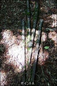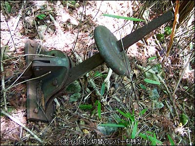 飯場を後にして歩くこと15分ほど。軌道跡を歩いているのだが、すぐ右手にも一段上がったところに軌道が見えてきた。この先まもなくでタイトなコーナーで折り返しになることが予想できる。歩き進むにつれレールは右カーブになっていき、確実に折り返しが近づいていることは間違いないが、なにかおかしい。自分が歩いている軌道と右手にあるもう一つの軌道の2つの軌道の間隔がとても近くなっているのだ。数メートルもなく、同じように右カーブになっている。カーブも非常に小さいものになり、半径は10mもないだろう。このままではループになってしまうのでは?と思った頃、なんと2つの軌道は切替ポイント(ポイントA)によって合流してしまった。あれ?あれ?レールはどうなってんだ?と状況が分からなくなってきたが、落ち着いて落ち葉に埋もれたD地点周辺のレールを辿ってみる。第一の切替ポイントより10数メートル進むと、もう一つ切替ポイント(ポイントB)が現れた。なんとこの切替ポイントではこのようなレバーも残っていた。ポイント自体、内大臣森林鉄道(鴨猪谷支線)で初めての発見である。さらにこのような装置(?)の発見には驚いた。もちろん切替の操作ができるかどうか動かしてみたが、基部の枕木が腐っているために、付け根部分がグラグラ動くだけだった。