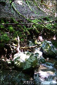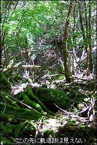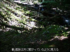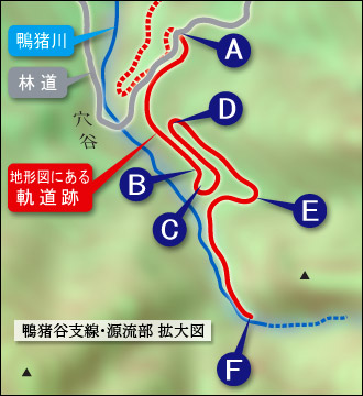 ループを後にして10分くらいだろうか。軌道跡は沢に近い位置を通っている。1/25000地形図で見ると軌道跡と思われる実線は、沢に当たって終わっている。もしかしたら終点か?結構疲れていたので、ちょっとだけ「終わり」を期待したのが本音だ。GPSには地図上で終点と思われる地点にポイントを登録してるが、少し距離がある。しかしこんな谷間ではGPSなんて当てにはならない。先を見ると軌道の先が沢になっている。いよいよ、ここで終点か?レールは土砂や倒木で見えないが地形で軌道跡は沢に繋がっている。感動!ここが終点だー!と思い、沢に下りてよく見たら(よく見なくても)レールは先に延びていた…。実は地図上では、まだE地点にいたのだった。ちょっとガッカリ…いや、まだまだ続いているからよかった!(?)