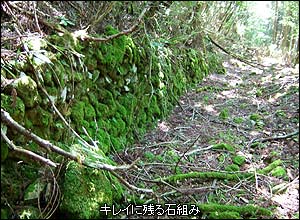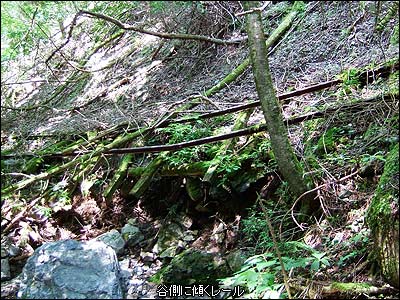 沢を越えると山側に長い石組みが現れた。苔生しているものの、丁寧に組まれた石組みは良い状態を保っている。足元も落ち葉や枯れ枝で分かりにくいが、2本のレールはしっかりと平行に並んでいる。しかし、そのような状況も100mも続かなかった。またもや大きく崩落している現場に出くわす。山側からの崩落でレールも谷側に押されてグニャグニャと曲がっている。谷はさほど深くなく5mほど下に沢が流れている。先ほどの沢より太いのでコチラが穴谷(鴨猪川)の本流だろう。