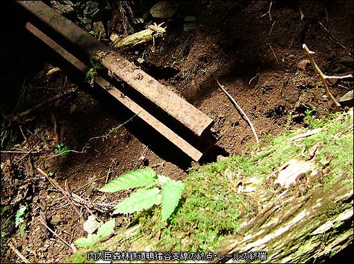 ついに内大臣森林鉄道鴨猪谷支線の終点に立つことができたが、もう一つ確認しておきたいことがあった。それは「レールの終端」だ。特に意味もないだろうが、折角だからレールの最後を見てみたいと思い、レールが途絶えている地点の土砂や倒木を取り除いてみる。すぐにレールの先端が現れた。レール同士を接続する2枚のプレートも付いていないので、ここが終端と考えていいようだ。支線の終点に立ち、少なからず感動もあったが、今来たルートを戻ることを考えるとちょっぴり辛い。ともあれ、この鴨猪谷支線の最深部の踏査では、多くの発見を得ることができた。現地調査や資料による調査を終えて、いろいろ見えてきたこともある。次回報告書では、この鴨猪谷支線をもう一度振り返ってみたい。