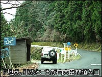 霊台橋から国道218号を山都町へ向けて2〜3km走ると右手に「内大臣」への標識が出る。国道から田舎道へ右折して5kmほどで内大臣橋だ。橋を緑川の南岸へ渡り、しばらくで県道153号との十字路(F地点)に出る。この十字を直進すると内大臣林道だ。ここではA地点に向かうために、県道153号へ一旦左折する。A地点では進行方向に対して左後へ入ることになるので注意していないと入り口を見つけられないだろう。