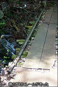 しばらくは見通しの悪い杉林の中を通るが、小川を渡る小さな橋にレールが使われているのを発見した。レールは本来の役目を終えても、その地で長く利用されるものなんだなあ、なんて考えていると軌道跡脇まで緑川が迫ってきた。