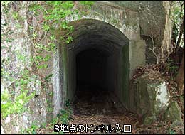 内大臣橋直下のB地点は内大臣森林鉄道の幹線で最も難所だったと言われる場所だ。断崖の岩をくり貫いたトンネルが見えてきた。正確には測定していないが、幅は2mもないだろう。かなり小さく感じるトンネルは、意外としっかりとしたコンクリート製坑門だ。内部は素彫りになっており、見事にS字にカーブしている。わざわざS字に掘らなければならなかった理由は分からないが、この峡谷に鉄道を通す苦労の跡をうかがい知ることができる。
