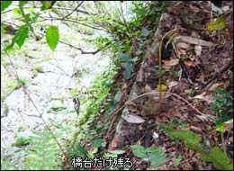 D地点からは完全に藪漕ぎになる。藪が深いからと引き返したのでは某氏に笑われてしまいそうなので気合を入れて藪に突入したものの、毛虫が沢山いて参った。またトゲトゲの植物にも非常にムカつく。たまに杉林の中に入るので、その間は藪がなくなり快適になるが、倒木なども多く楽ではない。しかし、そのような中でも軌道跡の路盤はしっかりしており、ところどころ崩れているものの痕跡はわかりやすい。D地点付近では、進行方向右手の緑川と軌道跡の距離が随分と近くなってきて、ダム湖が近づいてきていることを予感させた。そう感じたと同時ぐらいに、足元の軌道跡が左手山側より流れ込む沢によって、スパッと切断れたE地点に出た。がけ崩れで路盤ごと流されたか?とも思ったが、足元と沢の向こう側には藪に埋もれながらも石組みの橋台を発見できた。おそらくガーター橋が掛けられていたのを撤去したのだろう。川へ下って迂回すれば先に進めそうでもあったが、状況からしてまもなく水没していることが予想できたので、内大臣橋周辺エリアの探索はここで終了とした。