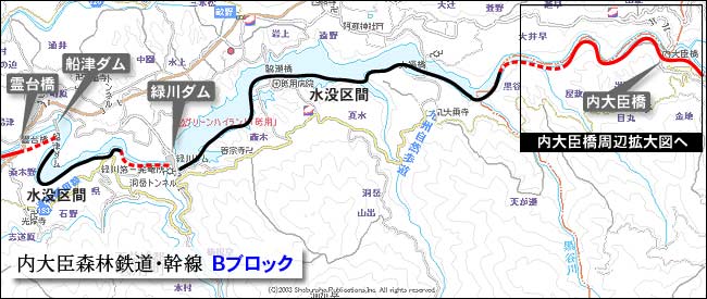 このBブロックは船津ダムと緑川ダムによるダム湖によって、その軌道跡の多くの区間を水没させている(黒線部分)。「鉄道廃線跡を歩くX」(JTBキャンブックス)によれば、それぞれのダムの直下(赤の破線部分)には軌道跡を確認できることが紹介されているが、現時点では(2005.6)この区間も未調査だ。いや、正直に言うと一度現地には足を運んでいるが、時間がなかったこともあり軌道跡と思われる痕跡を発見できなかったのだ。霊台橋付近を含めもう一度調査をしなければなるまい。