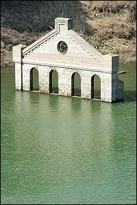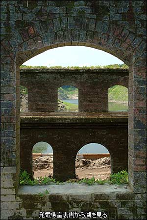 昭和36年、第二発電所の下流で川内川の洪水調整と発電を目的とした鶴田ダムの建設が始まる。ダム完成の昭和40年に第二発電所は廃止となり、湖底へと沈むこととなり今日に至る。が、ここでひとつ不思議なことに気が付いた。大きなダムが造られる場合、ダム湖には多くの家屋や建造物・木々などが沈むことになる。通常は全て撤去される事になるが、なぜこの曽木発電所は残っているのだろう。流出したりする可能性のないコンクリート構造物が解体されず湖底に残される例はあるが、この発電所も煉瓦作りという点から流出の可能性がないとされ撤去されずに済んだのだろうか。ともあれ、撤去されなかったが故にこの様なインパクトのある遺構として残り、保存の為に補強修復を受けるまでになったのである。ダム建設に伴い捨てられ湖底に沈んだ建物が、40年経った今その産業遺産としての価値を見出され保存されるまでになったのはとても面白いことではないか。