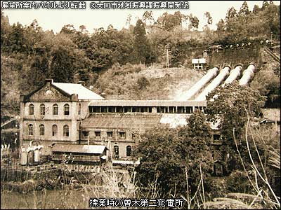 発電所の建屋は事務所や管理室のある3階建ての部分と、発電機がある2階建ての部分の2区画で構成され、総面積約669坪にもなる。水力発電所としては現在で考えても大きな建物だ。また明治時代に作られた総煉瓦造りの建造物としては、鹿児島県内唯一のものになるそうだ。もともと曽木の滝直下に第一発電所があり800kwの電力を生産していたが、更に下流でも発電所の建設が可能と分かり第二発電所が建設されたそうだ。水力発電は水の落差のエネルギーを使うので、更に下流の方が落差を稼げて都合がよかったのだろう。 |